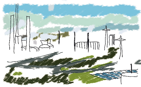 Ein schönes Foto: Helle Farben, gutes Wetter, klares Blau, saftiges Grün. Eine Industrielandschaft mit viel Produktivität und ohne Schmutz. Ein schönes Foto. Wo liegt nochmal Alsum? Harmonisch verbinden sich Industrie und Natur. Es sieht ein wenig unruhig aus, wie im Ruhrgebiet an vielen Stellen. Nur noch sauberer. Wenige und kleine weiße Wolken heben das Blau noch hervor. Malerisch sind Geschäftigkeit, Produktivität, Ingenieurskunst, Erfindungsgabe und Wohlstand in die Idylle eingebettet. Irgendwie strahlt das Foto auch Muße aus, auf jeden Fall aber Ordnung. – Nun, es ist kein Foto. Alsum ist nur gemalt. Das Gemälde ist also hyperrealistisch! Oder ist Alsum real? (Immerhin heißt ein Ortsteil von Duisburg so. Ein altes Fischerdorf.)