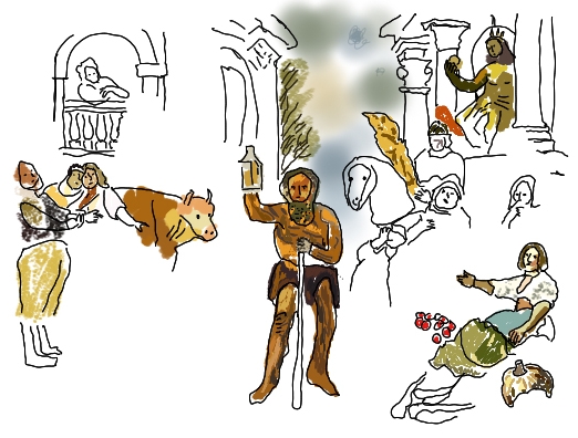 Der flämische Maler Jacob Jordaens (1593-1678) stellt den kynischen Philosophen Diogenes von Sinope (ca. 391/399-323 v. Chr.) in das Zentrum seines Gemäldes „Diogenes mit der Laterne auf dem Markt Menschen suchend.“ Drohend (oder tastend?) steht er dort fast nackt und gestützt auf einen Stab. Am helllichten Tag steht er dort und hält eine Laterne mit hocherhobenem Arm dem Betrachter entgegen. Diogenes tat das wirklich! Er suchte mit der Laterne auf dem Markt in Athen nach einem „wirklichen“ Menschen unter seinen Mitbürgern. Das Barockgemälde gibt im Hintergrund einen schmalen Blick auf die schlichte Natur frei, die in die marode Architektur und damit in den Bereich der Kultur hineinreicht, in diese Szenerie mit üppigen Säulen und prächtigen Tieren. Am natürlichsten wirkt hier Diogenes selbst: nackt, wie er geboren wurde, wird er bestaunt, belacht, verachtet. Die schwelgenden Menschen denken über ihn nach, doch diese Szene wird zum Glück nur eine kurze Irritation ihres Glücks sein. Ihnen ist es licht genug. Diogenes’ Funzel erscheint bei Licht betrachtet doch zu lächerlich!